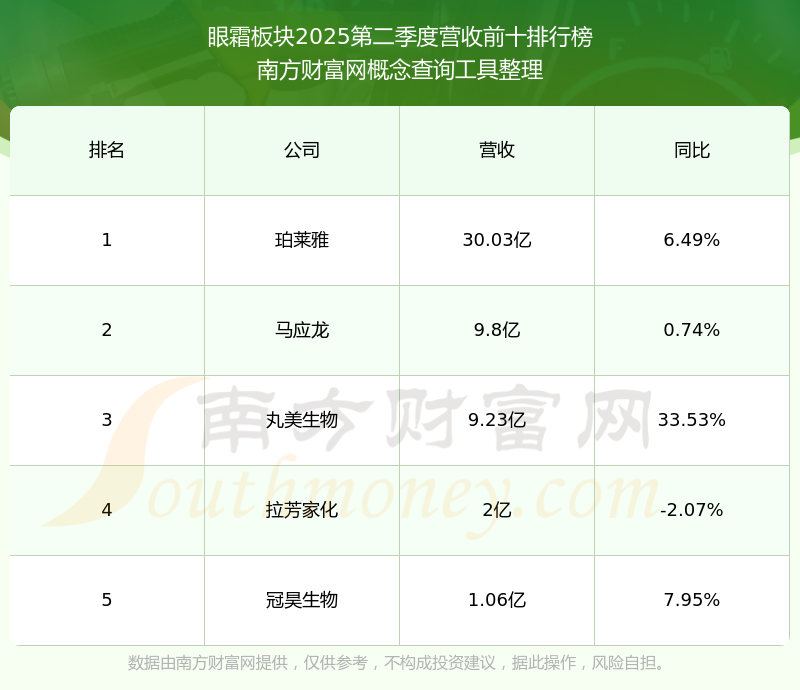 按照南方財(cái)富網(wǎng)概念查詢工具統(tǒng)計(jì),該股所屬板塊為眼霜板塊,該板塊共有5只股票,丸美生物2025第二季度營收在該板塊中排名為第3名,該板塊2025第二季度營收排名前十的股票如下表: