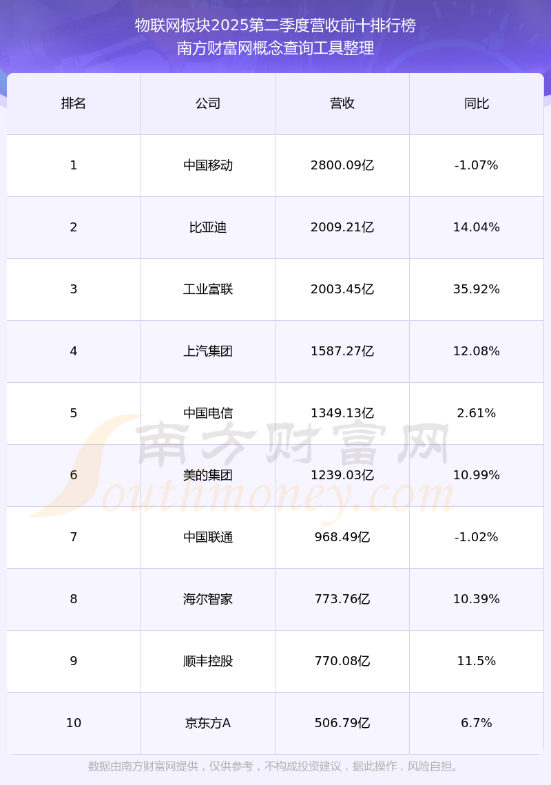 按照南方財(cái)富網(wǎng)概念查詢工具統(tǒng)計(jì),該股所屬板塊為物聯(lián)網(wǎng)板塊,該板塊共有539只股票,映翰通2025第二季度營(yíng)收在該板塊中排名為第372名,該板塊2025第二季度營(yíng)收排名前十的股票如下表: