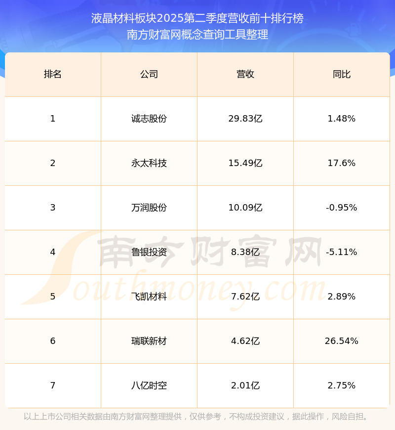 按照南方財(cái)富網(wǎng)概念查詢工具統(tǒng)計(jì),該股所屬板塊為液晶材料板塊,該板塊共有7只股票,八億時(shí)空2025第二季度營(yíng)收在該板塊中排名為第7名,該板塊2025第二季度營(yíng)收排名前十的股票如下表: