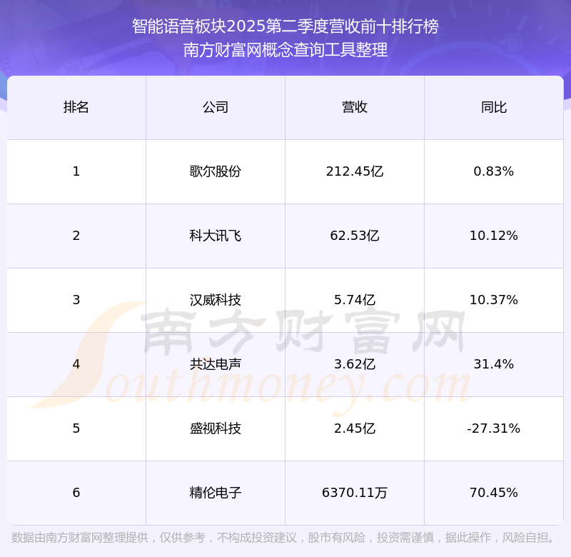 按照南方財(cái)富網(wǎng)概念查詢工具統(tǒng)計(jì),該股所屬板塊為智能語(yǔ)音板塊,該板塊共有6只股票,海天瑞聲2025第二季度營(yíng)收在該板塊中排名為第6名,該板塊2025第二季度營(yíng)收排名前十的股票如下表: