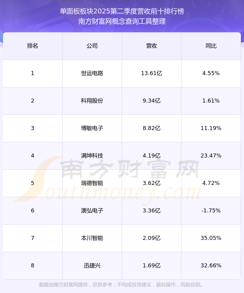 按照南方財(cái)富網(wǎng)概念查詢工具統(tǒng)計(jì),該股所屬板塊為單面板板塊,該板塊共有8只股票,澳弘電子2025第二季度營(yíng)收在該板塊中排名為第6名,該板塊2025第二季度營(yíng)收排名前十的股票如下表: