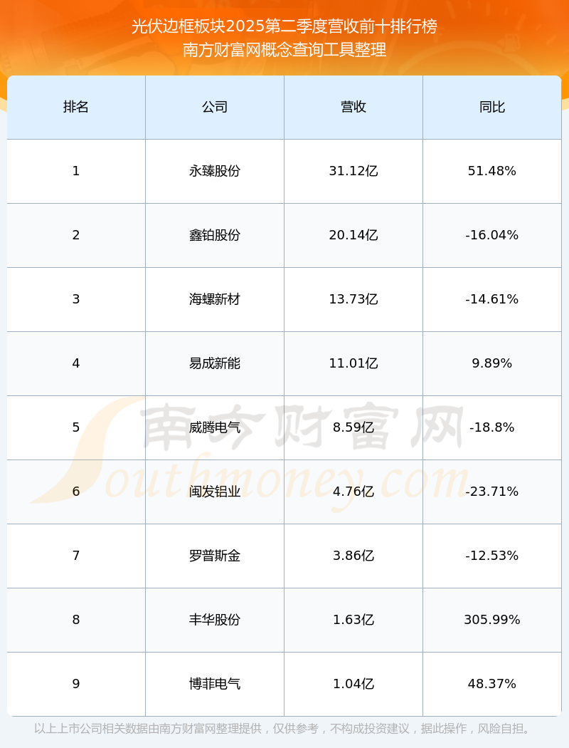 按照南方財(cái)富網(wǎng)概念查詢工具統(tǒng)計(jì),該股所屬板塊為光伏邊框板塊,該板塊共有9只股票,永臻股份2025第二季度營(yíng)收在該板塊中排名為第1名,該板塊2025第二季度營(yíng)收排名前十的股票如下表: