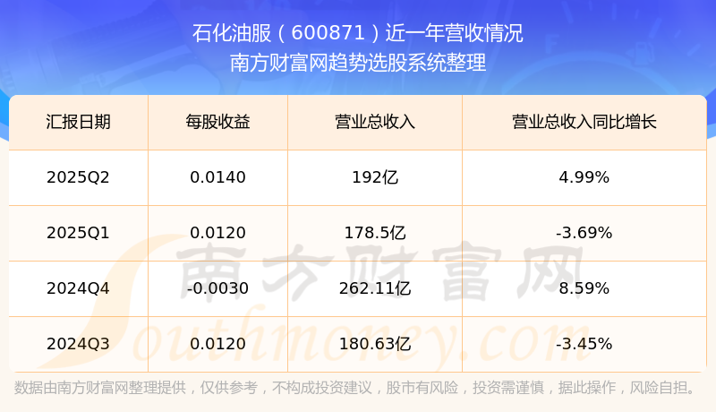 2025年第二季度,石化油服營收同比4.99%,凈利潤同比-0.16%。