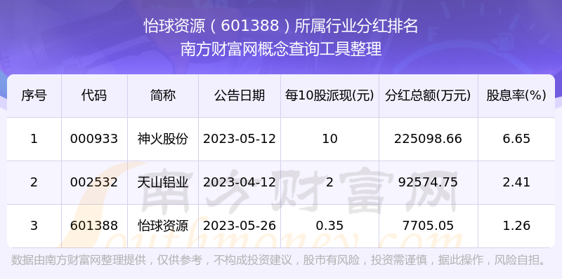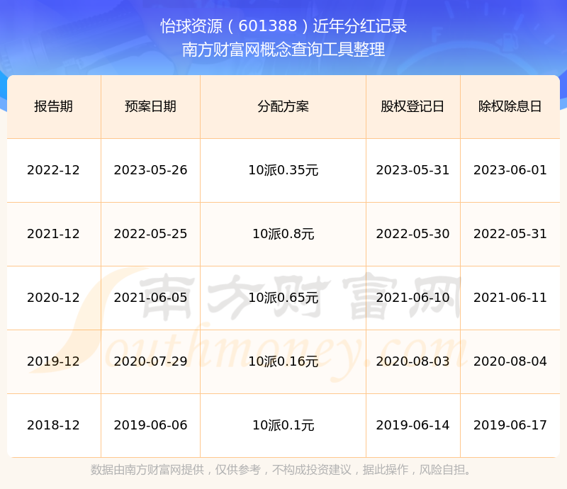 怡球資源最新一次公布的分紅方案為10派0.35元。本次權(quán)益分派股權(quán)登記日為2023年5月31日,除權(quán)除息日為2023年6月1日,派息日為2023年6月1日。