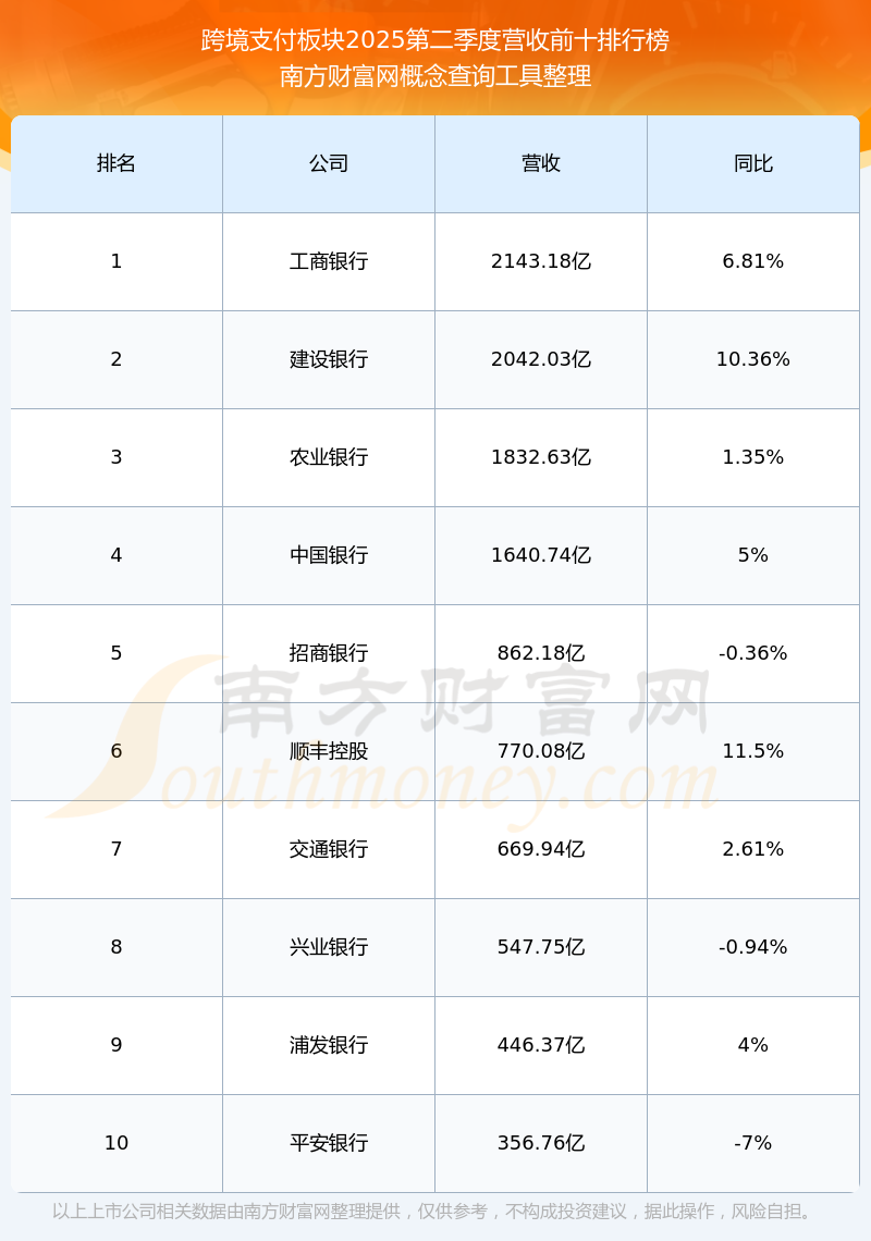 按照南方財(cái)富網(wǎng)概念查詢工具統(tǒng)計(jì),該股所屬板塊為跨境支付板塊,該板塊共有89只股票,中國銀行2025第二季度營收在該板塊中排名為第4名,該板塊2025第二季度營收排名前十的股票如下表:
