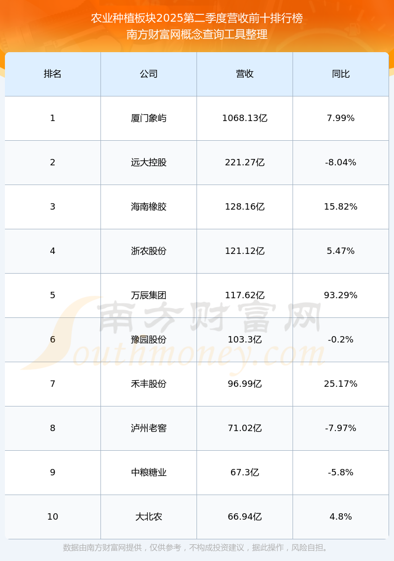 按照南方財(cái)富網(wǎng)概念查詢工具統(tǒng)計(jì),該股所屬板塊為農(nóng)業(yè)種植板塊,該板塊共有102只股票,農(nóng)發(fā)種業(yè)2025第二季度營(yíng)收在該板塊中排名為第35名,該板塊2025第二季度營(yíng)收排名前十的股票如下表: