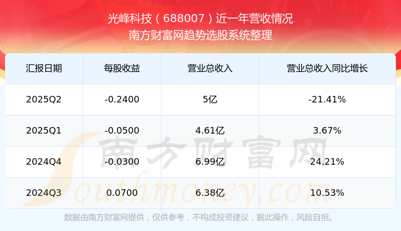 在2025年第二季度,光峰科技的業(yè)績表現(xiàn),主營業(yè)務收入達到5億元,實現(xiàn)了-21.41%的同比增長率。同時,公司歸母凈利潤錄得-1.1億元,同比增長-225.81%。