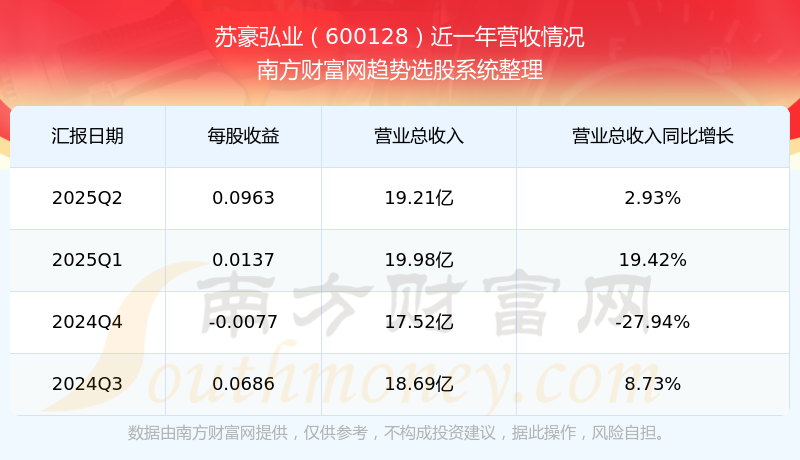 蘇豪弘業(yè)2025年第二季度財(cái)報(bào)顯示,公司主營收入19.21億元,同比2.93%;歸母凈利潤2292.15萬元,同比39.07%;扣非凈利潤685.58萬元,同比-69.93%;