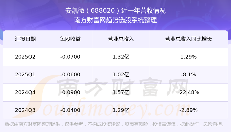 安凱微(688620)發(fā)布2025年第二季度財(cái)報(bào)。2025年第二季度安凱微實(shí)現(xiàn)營(yíng)業(yè)收入1.32億元,同比增加1.29元%,環(huán)比增加30.05%;凈利潤(rùn)為-2714.83萬元,同比增長(zhǎng)-2760.74%,環(huán)比增長(zhǎng)-22.83%。