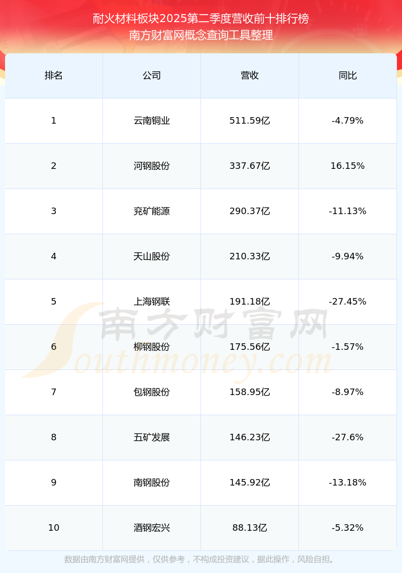 按照南方財富網概念查詢工具統(tǒng)計,該股所屬板塊為耐火材料板塊,該板塊共有38只股票,中鋼洛耐2025第二季度營收在該板塊中排名為第26名,該板塊2025第二季度營收排名前十的股票如下表: