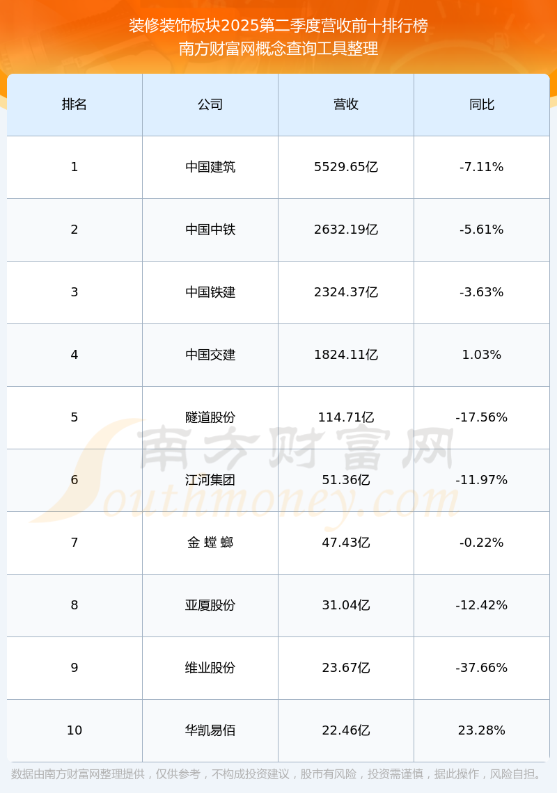 按照南方財富網(wǎng)概念查詢工具統(tǒng)計,該股所屬板塊為裝修裝飾板塊,該板塊共有59只股票,華立股份2025第二季度營收在該板塊中排名為第33名,該板塊2025第二季度營收排名前十的股票如下表: