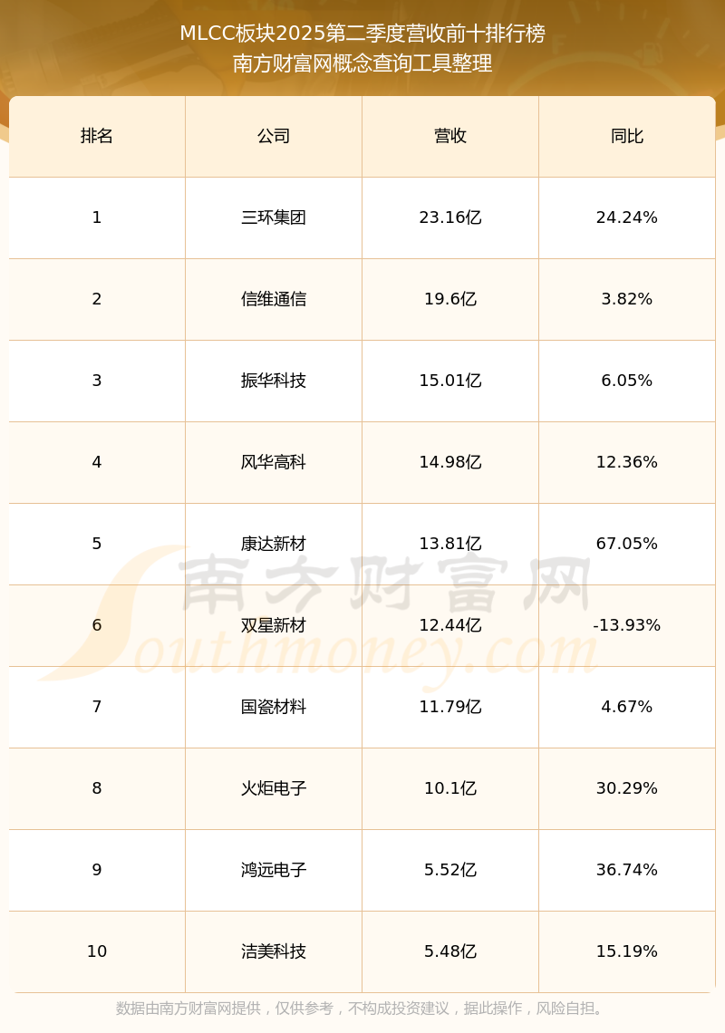 按照南方財富網(wǎng)概念查詢工具統(tǒng)計,該股所屬板塊為MLCC板塊,該板塊共有15只股票,鴻遠(yuǎn)電子2025第二季度營收在該板塊中排名為第9名,該板塊2025第二季度營收排名前十的股票如下表: