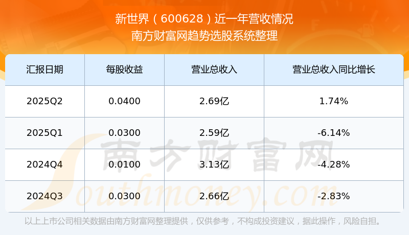 財報顯示,2025年第二季度新世界營收2.69億元,同比增長1.74%,凈利潤2839.82萬元,同比增長37.26%。