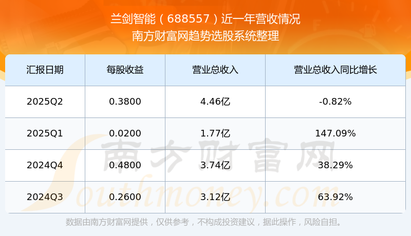 蘭劍智能2025年第二季度公司實(shí)現(xiàn)營(yíng)業(yè)收入4.46億元,同比-0.82%;歸母凈利潤(rùn)3971.77萬(wàn)元,同比-16.91%。