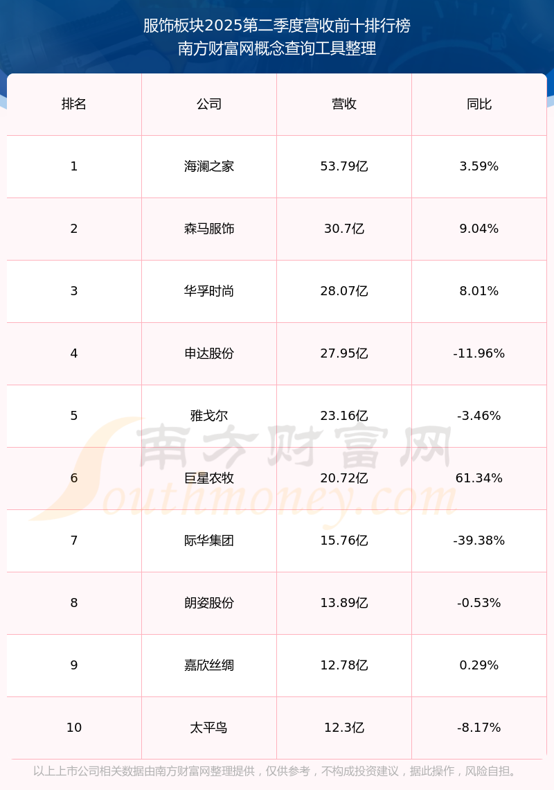 按照南方財富網(wǎng)概念查詢工具統(tǒng)計,該股所屬板塊為服飾板塊,該板塊共有54只股票,健盛集團(tuán)2025第二季度營收在該板塊中排名為第21名,該板塊2025第二季度營收排名前十的股票如下表: