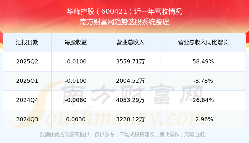 華嶸控股2025年第二季度顯示,公司主營收入3559.71萬元,同比58.49%;歸母凈利潤-251.16萬元,同比8.88%;扣非凈利潤-276.27萬元,同比8.42%。