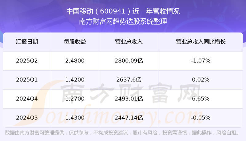 中國移動(dòng)披露了2025年第二季度財(cái)報(bào)。報(bào)告顯示,中國移動(dòng)2025年第二季度實(shí)現(xiàn)營收2800.09億元,同比-1.07%;歸母凈利潤536.04億元,同比5.95%。