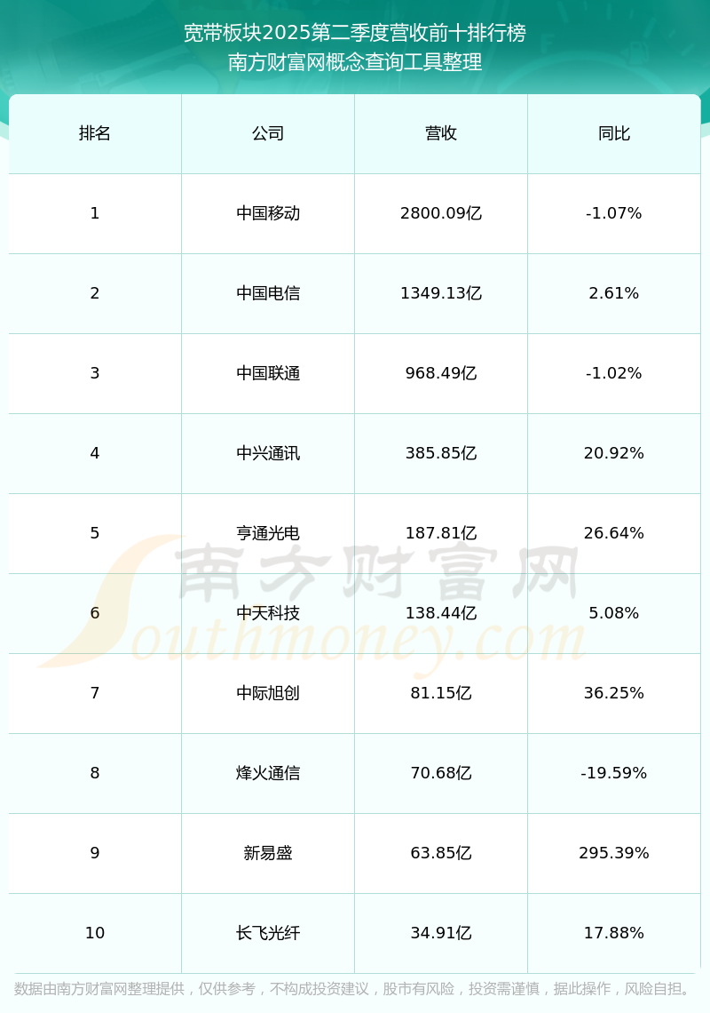 按照南方財(cái)富網(wǎng)概念查詢工具統(tǒng)計(jì),該股所屬板塊為寬帶板塊,該板塊共有18只股票,中國移動(dòng)2025第二季度營收在該板塊中排名為第1名,該板塊2025第二季度營收排名前十的股票如下表: