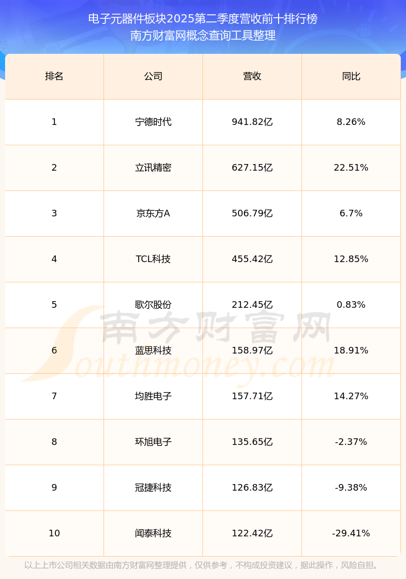 按照南方財富網概念查詢工具統(tǒng)計,該股所屬板塊為電子元器件板塊,該板塊共有161只股票,晶方科技2025第二季度營收在該板塊中排名為第161名,該板塊2025第二季度營收排名前十的股票如下表: