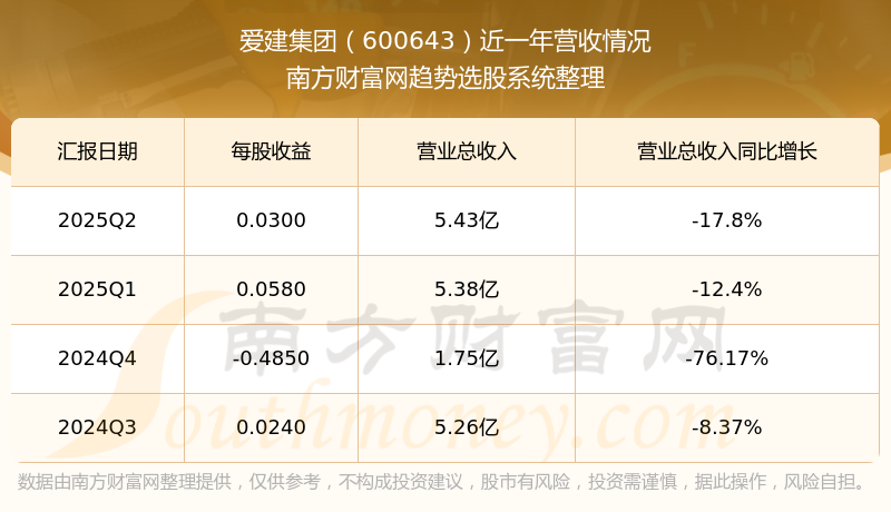 于2025年第二季度,愛建集團(tuán)披露了其業(yè)績表現(xiàn),其中主營業(yè)務(wù)收入5.43億元,相較于去年同期-17.8%。此外,公司歸屬于母公司的凈利潤為4753.87萬元,同比增長了-49.94%。在扣除所有非經(jīng)常性損益后,凈利潤-2356.67萬元,同比增長-124.82%。