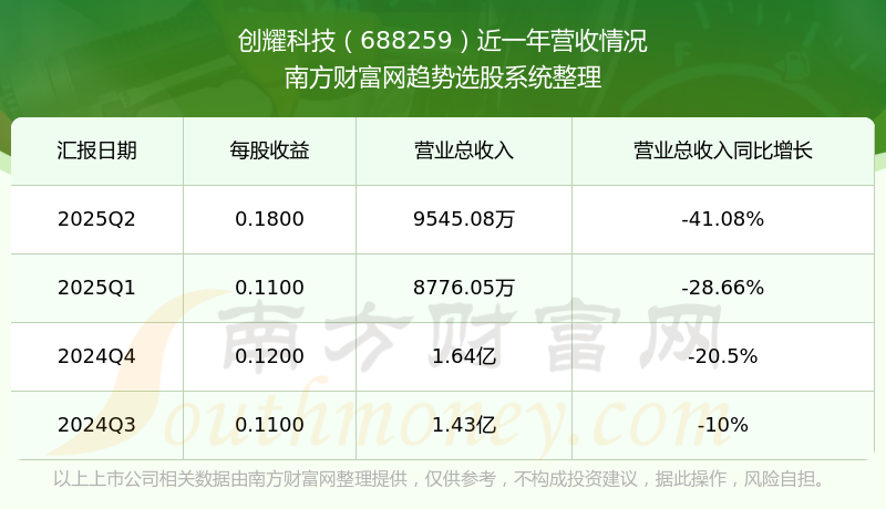 創(chuàng)耀科技2025年第二季度財報顯示,公司主營收入9545.08萬元,同比-41.08%;歸母凈利潤2010.64萬元,同比1.42%;扣非凈利潤1569.38萬元,同比2.99%;