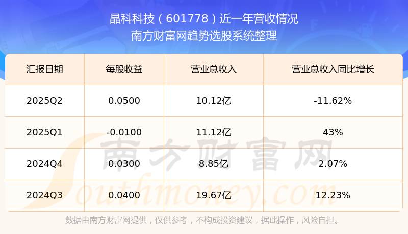 晶科科技2025年第二季度顯示,公司主營(yíng)收入10.12億元,同比-11.62%;歸母凈利潤(rùn)1.58億元,同比-15.48%;扣非凈利潤(rùn)9652.71萬(wàn)元,同比-45.42%;