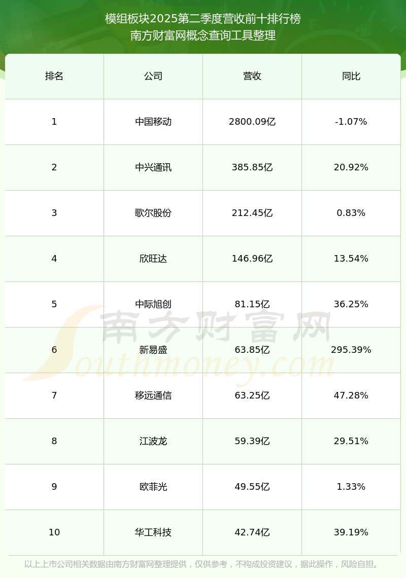 按照南方財(cái)富網(wǎng)概念查詢(xún)工具統(tǒng)計(jì),該股所屬板塊為模組板塊,該板塊共有34只股票,富創(chuàng)精密2025第二季度營(yíng)收在該板塊中排名為第34名,該板塊2025第二季度營(yíng)收排名前十的股票如下表: