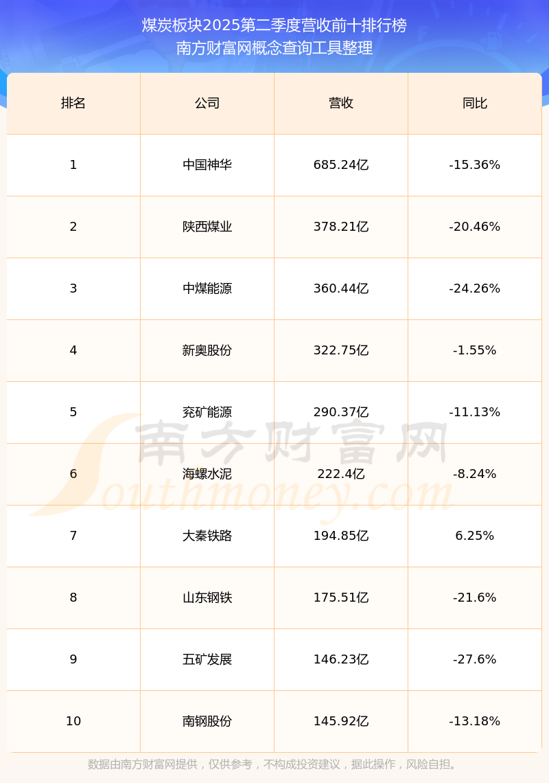 按照南方財富網(wǎng)概念查詢工具統(tǒng)計,該股所屬板塊為煤炭板塊,該板塊共有71只股票,中國神華2025第二季度營收在該板塊中排名為第1名,該板塊2025第二季度營收排名前十的股票如下表: