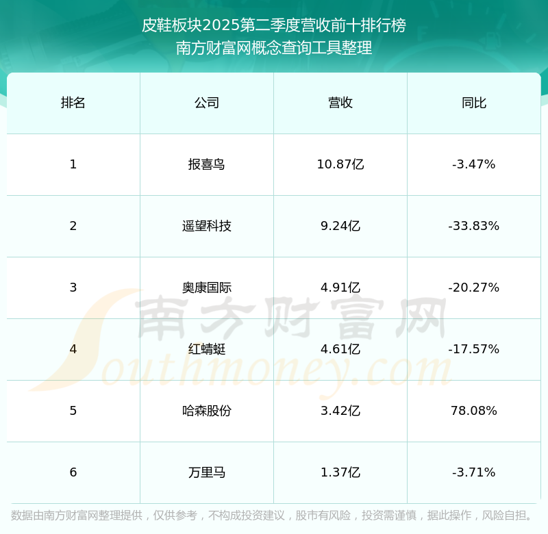 按照南方財富網概念查詢工具統(tǒng)計,該股所屬板塊為皮鞋板塊,該板塊共有6只股票,紅蜻蜓2025第二季度營收在該板塊中排名為第4名,該板塊2025第二季度營收排名前十的股票如下表: