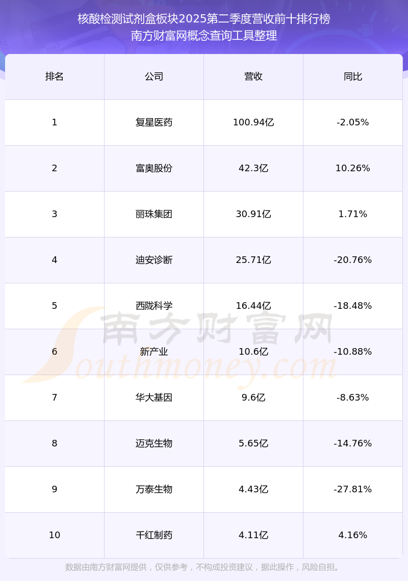 按照南方財(cái)富網(wǎng)概念查詢工具統(tǒng)計(jì),該股所屬板塊為核酸檢測(cè)試劑盒板塊,該板塊共有27只股票,之江生物2025第二季度營(yíng)收在該板塊中排名為第27名,該板塊2025第二季度營(yíng)收排名前十的股票如下表: