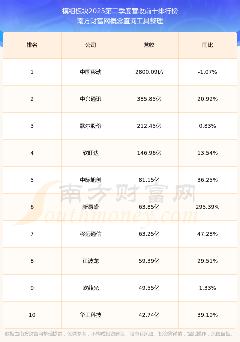 按照南方財(cái)富網(wǎng)概念查詢工具統(tǒng)計(jì),該股所屬板塊為模組板塊,該板塊共有34只股票,唯捷創(chuàng)芯2025第二季度營收在該板塊中排名為第34名,該板塊2025第二季度營收排名前十的股票如下表: