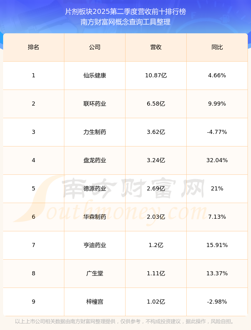 按照南方財富網(wǎng)概念查詢工具統(tǒng)計,該股所屬板塊為片劑板塊,該板塊共有9只股票,聯(lián)環(huán)藥業(yè)2025第二季度營收在該板塊中排名為第2名,該板塊2025第二季度營收排名前十的股票如下表: