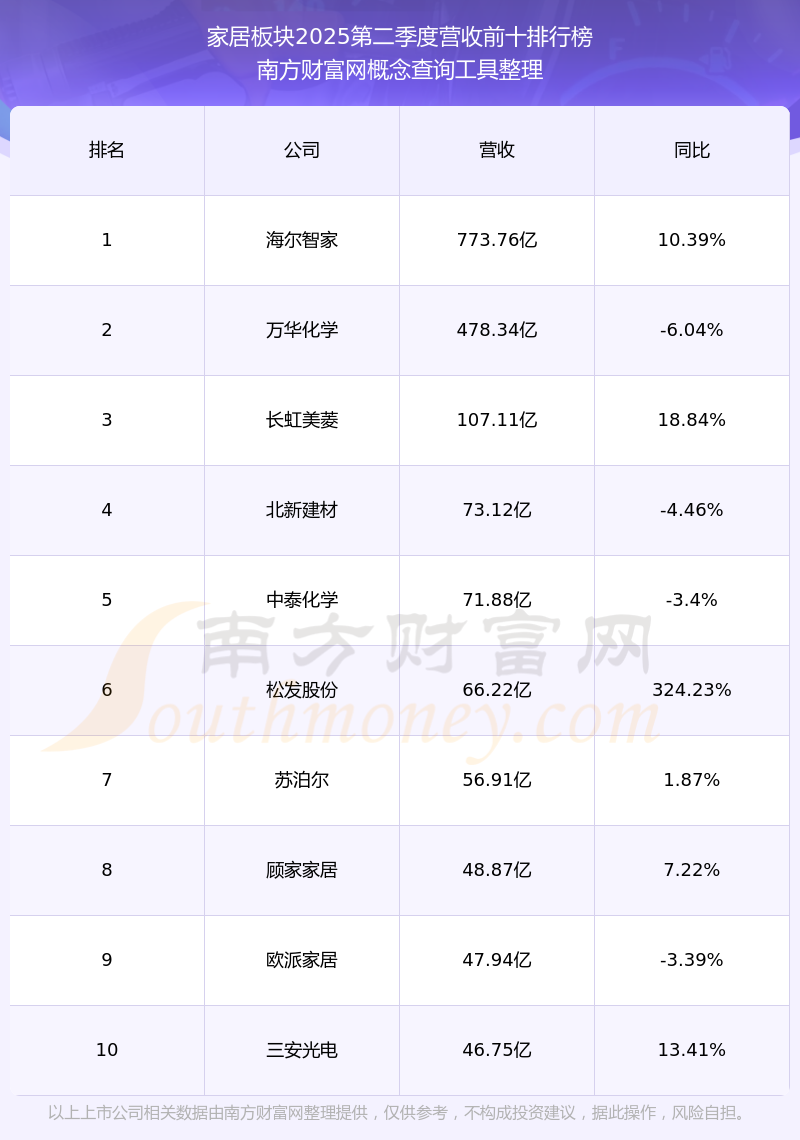 按照南方財富網(wǎng)概念查詢工具統(tǒng)計,該股所屬板塊為家居板塊,該板塊共有166只股票,建霖家居2025第二季度營收在該板塊中排名為第45名,該板塊2025第二季度營收排名前十的股票如下表: