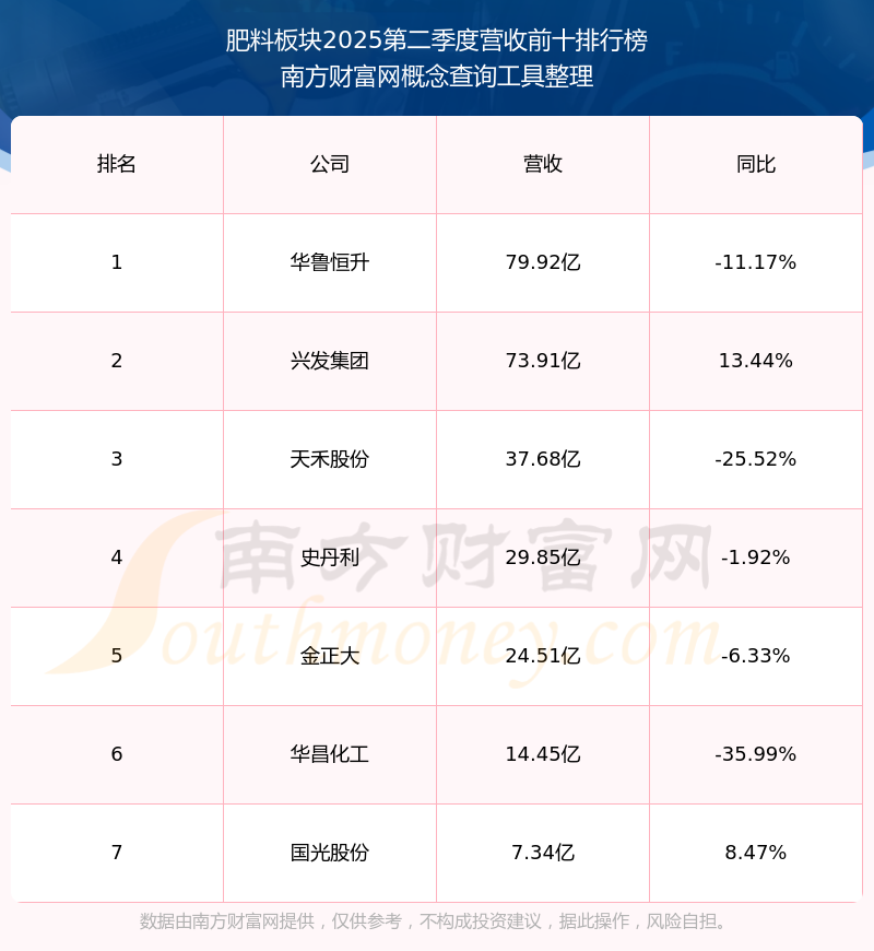 按照南方財富網(wǎng)概念查詢工具統(tǒng)計,該股所屬板塊為肥料板塊,該板塊共有7只股票,興發(fā)集團(tuán)2025第二季度營收在該板塊中排名為第2名,該板塊2025第二季度營收排名前十的股票如下表: