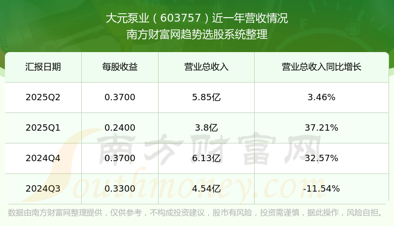 大元泵業(yè)2025年第二季度顯示,公司主營收入5.85億元,同比3.46%;歸母凈利潤6163.63萬元,同比-37.88%;扣非凈利潤5726.42萬元,同比-12.25%;