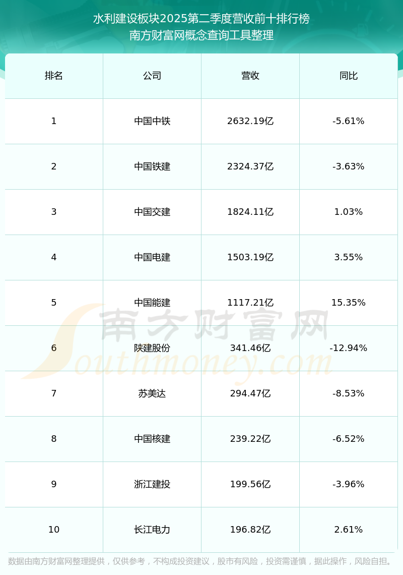 按照南方財富網(wǎng)概念查詢工具統(tǒng)計,該股所屬板塊為水利建設(shè)板塊,該板塊共有136只股票,大元泵業(yè)2025第二季度營收在該板塊中排名為第77名,該板塊2025第二季度營收排名前十的股票如下表:
