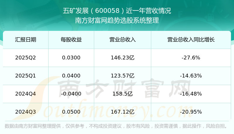 財(cái)報(bào)顯示,2025年第二季度五礦發(fā)展?fàn)I收146.23億元,同比增長-27.6%,凈利潤4063.14萬元,同比增長-74.35%。