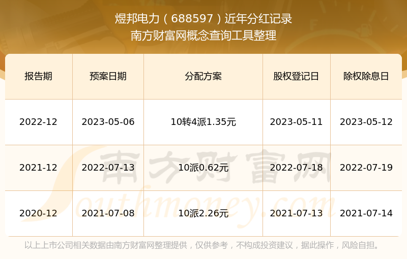 煜邦電力最新一次公布的分紅方案為10轉(zhuǎn)4派1.35元。本次權(quán)益分派股權(quán)登記日為2023年5月11日,除權(quán)除息日為2023年5月12日,派息日為2023年5月12日。