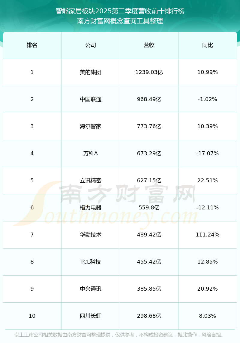 按照南方財富網(wǎng)概念查詢工具統(tǒng)計,該股所屬板塊為智能家居板塊,該板塊共有303只股票,惠達衛(wèi)浴2025第二季度營收在該板塊中排名為第152名,該板塊2025第二季度營收排名前十的股票如下表: