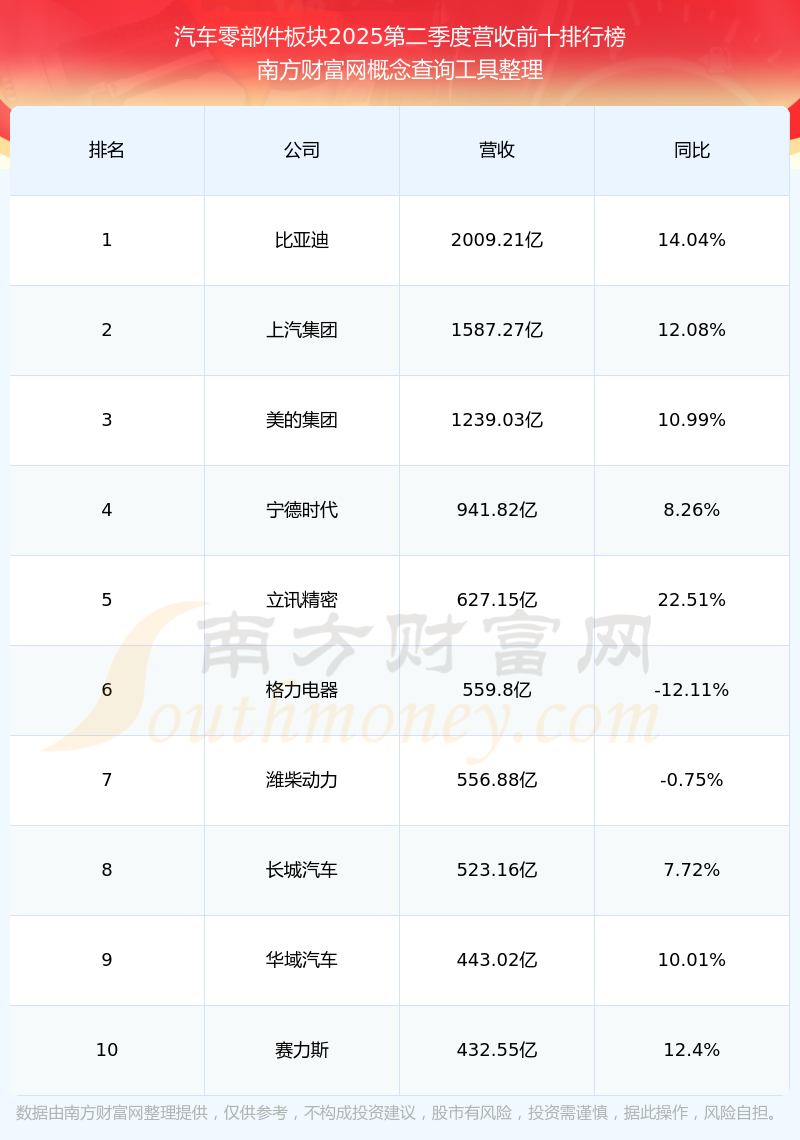 按照南方財(cái)富網(wǎng)概念查詢工具統(tǒng)計(jì),該股所屬板塊為汽車零部件板塊,該板塊共有588只股票,秦安股份2025第二季度營收在該板塊中排名為第384名,該板塊2025第二季度營收排名前十的股票如下表: