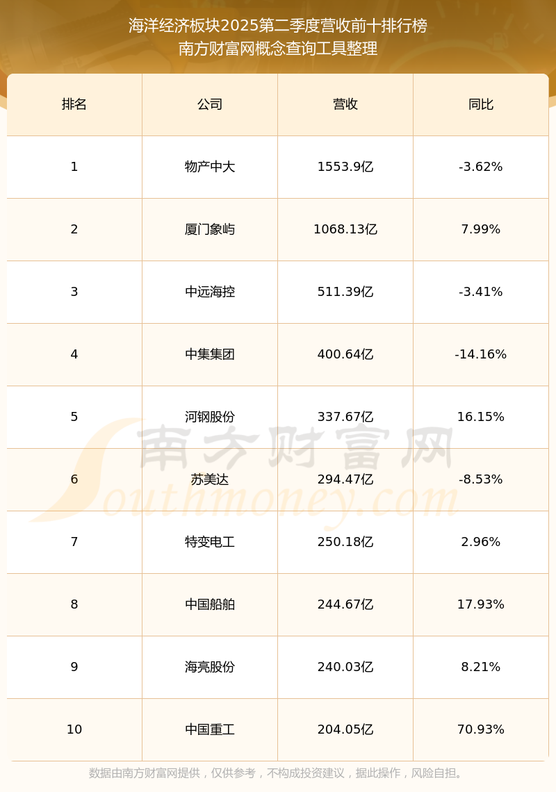 按照南方財(cái)富網(wǎng)概念查詢工具統(tǒng)計(jì),該股所屬板塊為海洋經(jīng)濟(jì)板塊,該板塊共有153只股票,好當(dāng)家2025第二季度營收在該板塊中排名為第84名,該板塊2025第二季度營收排名前十的股票如下表: