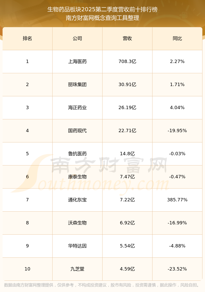按照南方財(cái)富網(wǎng)概念查詢工具統(tǒng)計(jì),該股所屬板塊為生物藥品板塊,該板塊共有20只股票,三生國(guó)健2025第二季度營(yíng)收在該板塊中排名為第20名,該板塊2025第二季度營(yíng)收排名前十的股票如下表:
