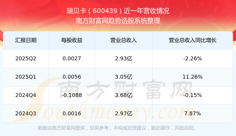 財(cái)報(bào)顯示,2025年第二季度瑞貝卡營(yíng)收2.93億元,同比增長(zhǎng)-2.26%,凈利潤(rùn)301.53萬元,同比增長(zhǎng)8.96%。
