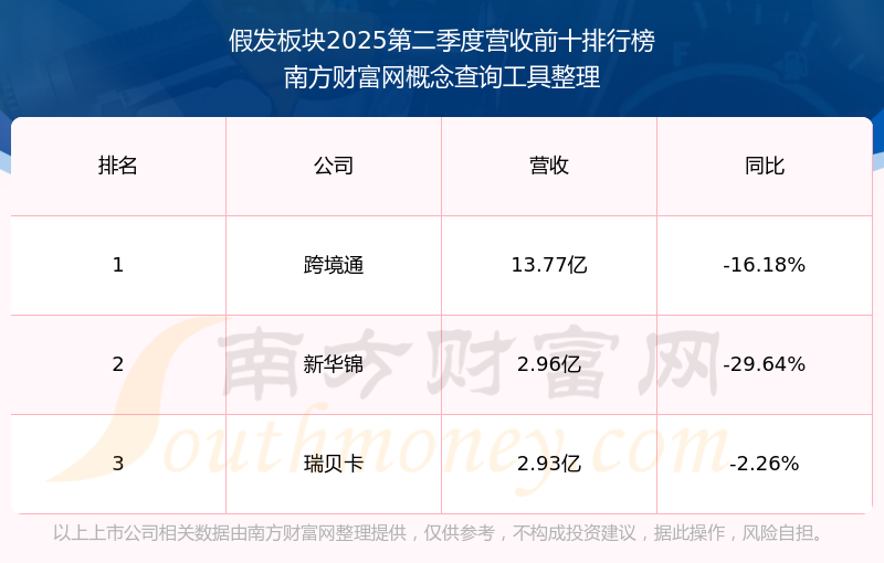 按照南方財(cái)富網(wǎng)概念查詢工具統(tǒng)計(jì),該股所屬板塊為假發(fā)板塊,該板塊共有3只股票,瑞貝卡2025第二季度營(yíng)收在該板塊中排名為第3名,該板塊2025第二季度營(yíng)收排名前十的股票如下表: