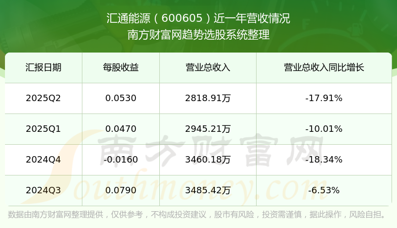 匯通能源(600605)披露2025年第二季度報(bào)告,報(bào)告期實(shí)現(xiàn)營收2818.91萬元,同比-17.91%;歸母凈利潤1102.29萬元,同比-84.41%;扣非凈利潤634.19萬元,同比31.56%;基本每股收益0.05元。