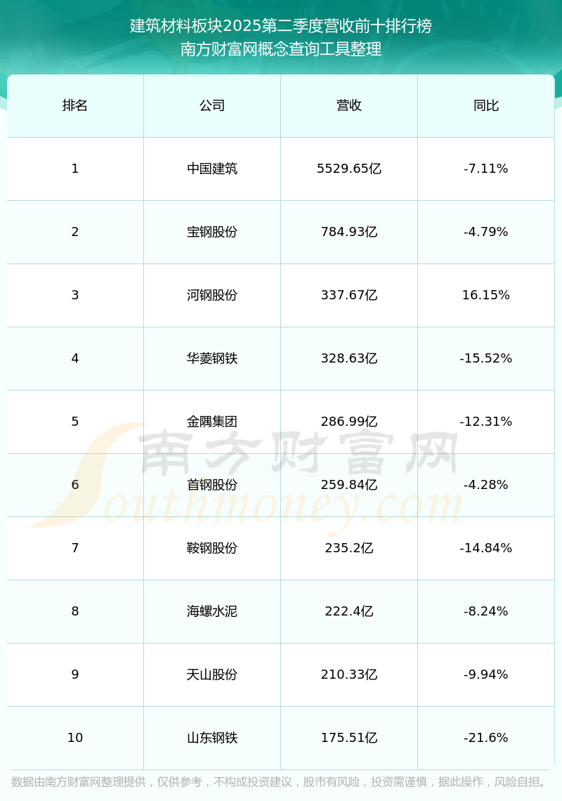 按照南方財(cái)富網(wǎng)概念查詢工具統(tǒng)計(jì),該股所屬板塊為建筑材料板塊,該板塊共有122只股票,美凱龍2025第二季度營(yíng)收在該板塊中排名為第122名,該板塊2025第二季度營(yíng)收排名前十的股票如下表: