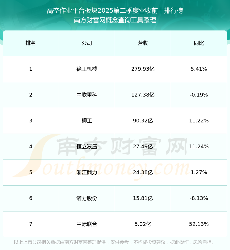 按照南方財富網(wǎng)概念查詢工具統(tǒng)計,該股所屬板塊為高空作業(yè)平臺板塊,該板塊共有7只股票,海南華鐵2025第二季度營收在該板塊中排名為第7名,該板塊2025第二季度營收排名前十的股票如下表: