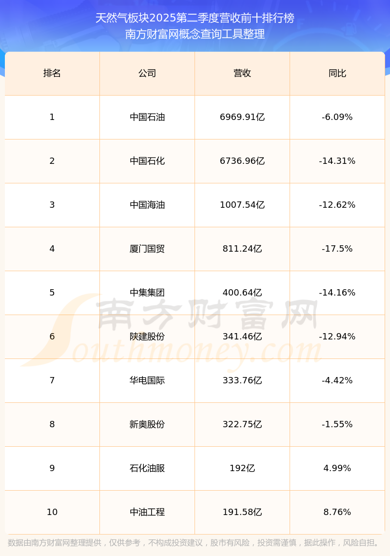 按照南方財(cái)富網(wǎng)概念查詢工具統(tǒng)計(jì),該股所屬板塊為天然氣板塊,該板塊共有157只股票,新奧股份2025第二季度營收在該板塊中排名為第8名,該板塊2025第二季度營收排名前十的股票如下表: