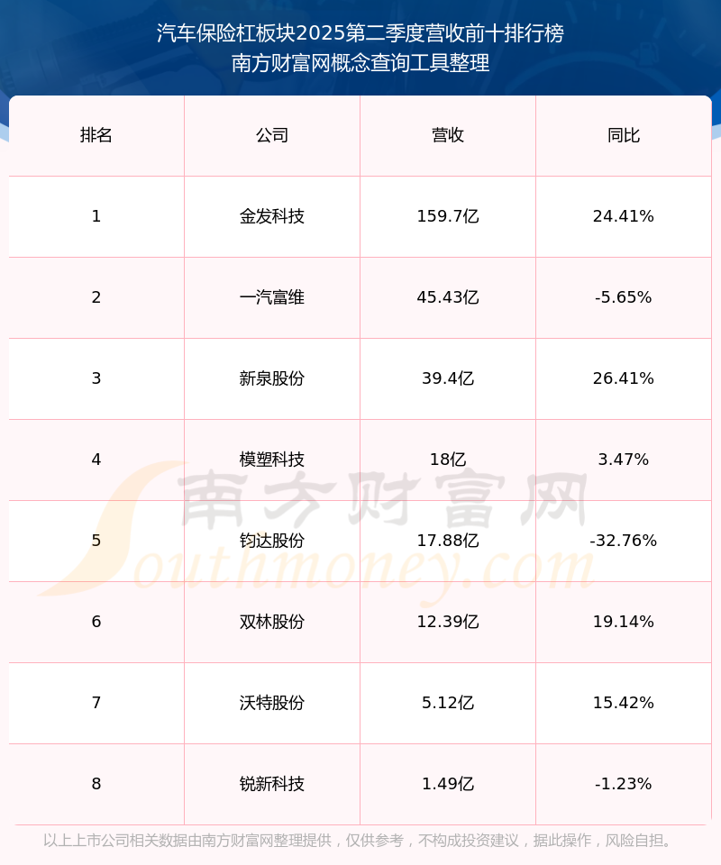 按照南方財富網(wǎng)概念查詢工具統(tǒng)計,該股所屬板塊為汽車保險杠板塊,該板塊共有8只股票,一汽富維2025第二季度營收在該板塊中排名為第2名,該板塊2025第二季度營收排名前十的股票如下表: