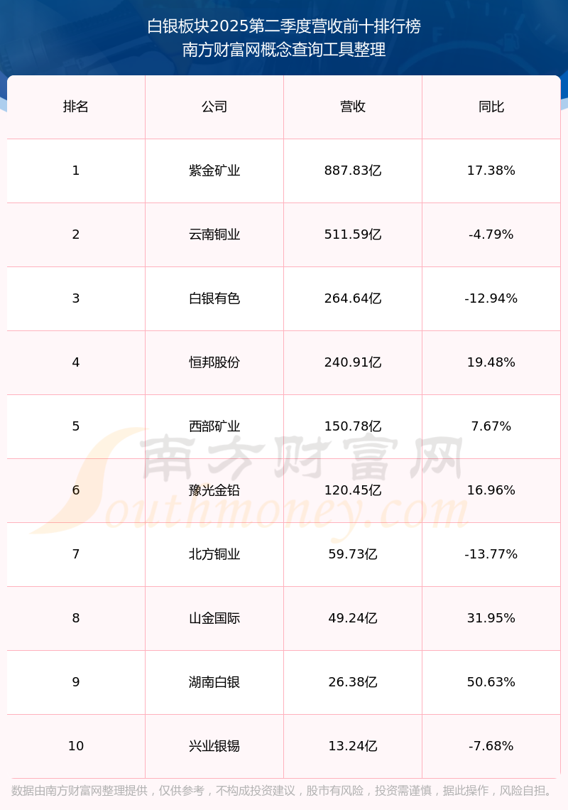 按照南方財(cái)富網(wǎng)概念查詢工具統(tǒng)計(jì),該股所屬板塊為白銀板塊,該板塊共有13只股票,鵬欣資源2025第二季度營收在該板塊中排名為第13名,該板塊2025第二季度營收排名前十的股票如下表: